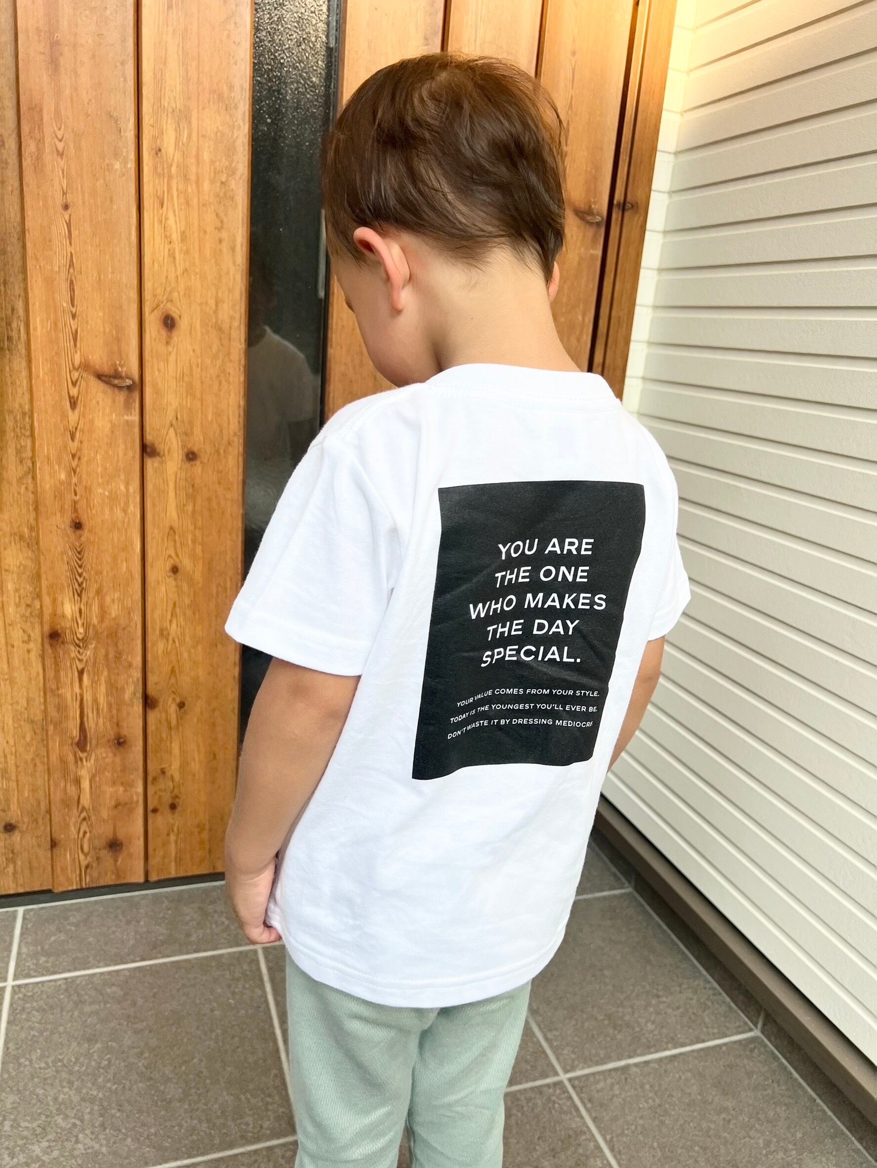 フロントにブランドタグ・バックにスクエアのデザインが入ったトレンドのデザインのキッズTシャツ。
