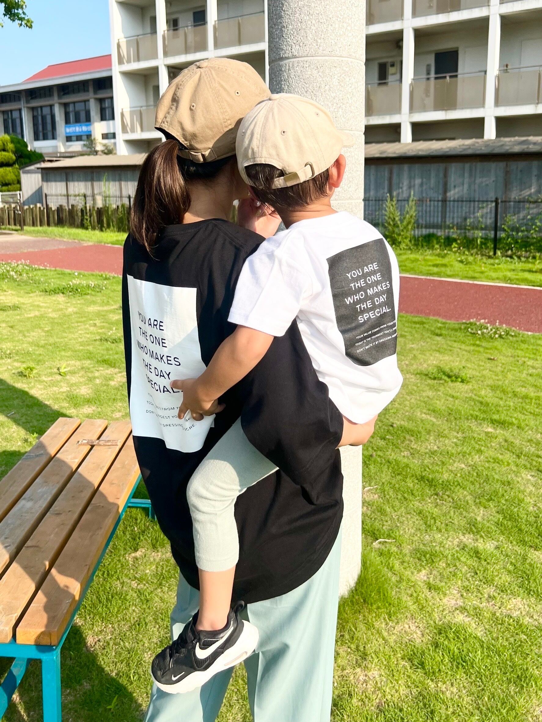 親子でお揃いでも着用できるように同デザイン(大人用はポケット有り)の大人用の通常サイズ(Lサイズ・XLサイズ)の作りもあります。